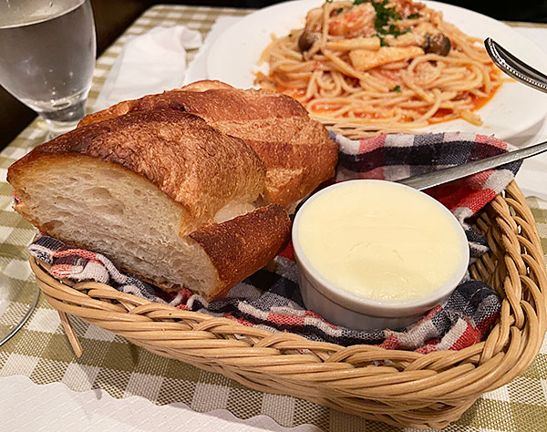 この熱々のフランスパンにたっぷりバターをつけると絶品です。
