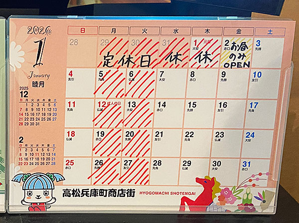 1月は月曜と火曜日が定休日です。